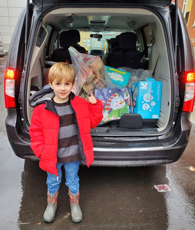 Ben Alberta Riehlmann, age six, has been helping with the program for three years. In the picture below he is about to go with his grandparents to the Learning Web Youth Outreach Program to deliver bags of gifts. Quote from Ben - "It's fun and it makes you feel good!"